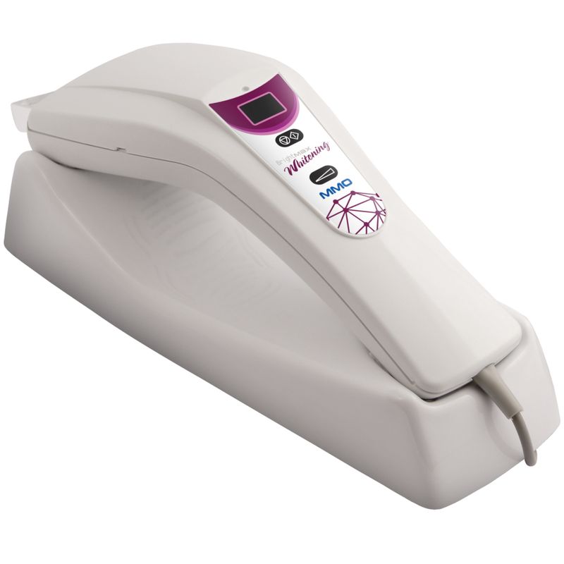 Clareador MMO Bright Max Whitening MMO Luz Violeta contém quatro super LEDS violeta de alta potência ótica numa única peça de mão. A luz é projetada por ponta acrílica exclusiva MMO que permite o clareamento simultâneo de ambas as arcadas dentárias. O Bright Max Whitening é produzido com equipamentos certificados e desenvolvido com inovador sistema de ponteiras que canalizam o foco da luz violeta emitida pelos 4 SUPER LEDS VIOLETA.