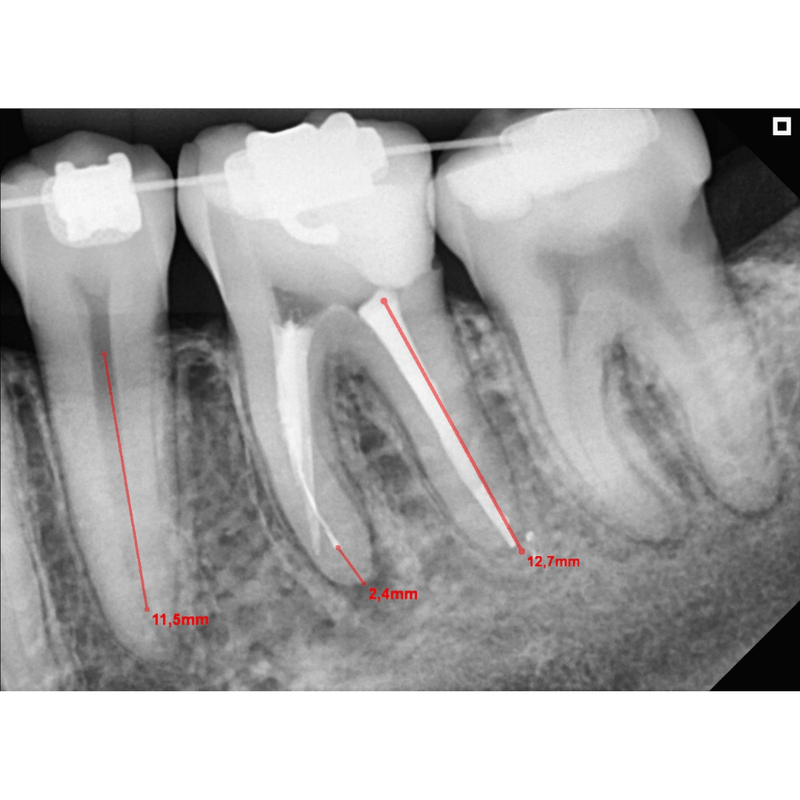 Várias ferramentas de edição para elaboração de diagnósticos precisos: rotação, zoom, ajuste de brilho, contraste e gama, inversão de cores, inserção de texto, símbolos, seleção e recorte de áreas, medição de ângulos e segmentos, barra para laudos/diagnóstico, odontograma e comparação de imagens em tela cheia