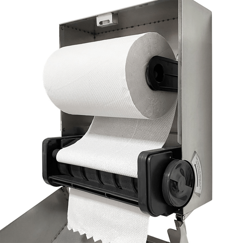 Dispenser de parede para papel toalha em bobina. Funciona no sistema autocorte: puxa e corta