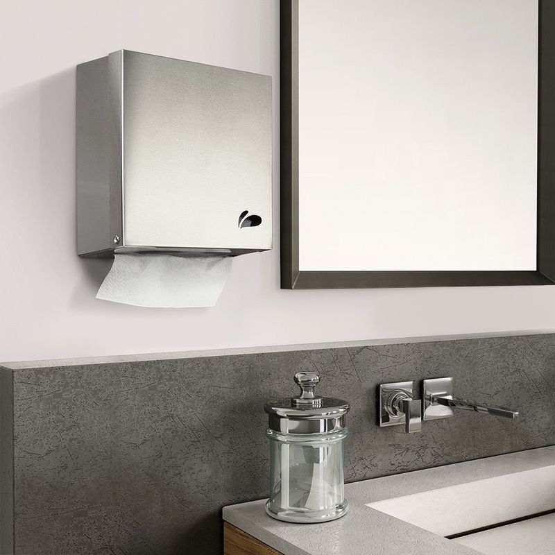 Dispenser de parede em aço inox para papel toalha interfolhado.
