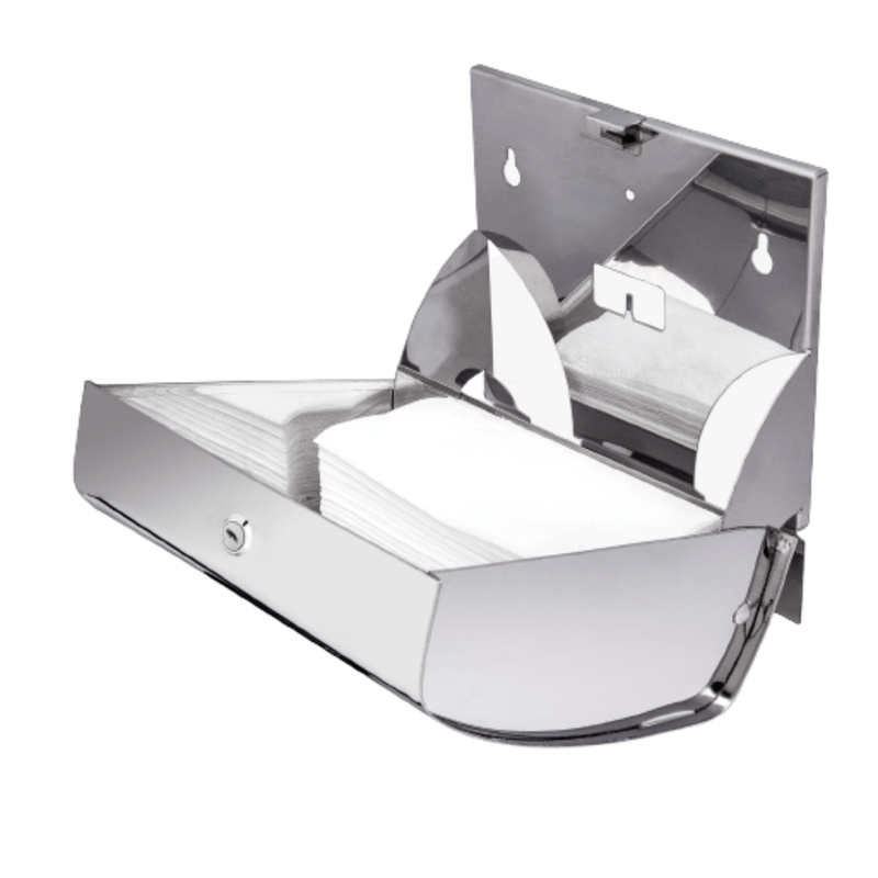 Dispenser de parede para papel toalha interfolhas, em aço inox de qualidade. Possui chave de segurança e visor de nível.